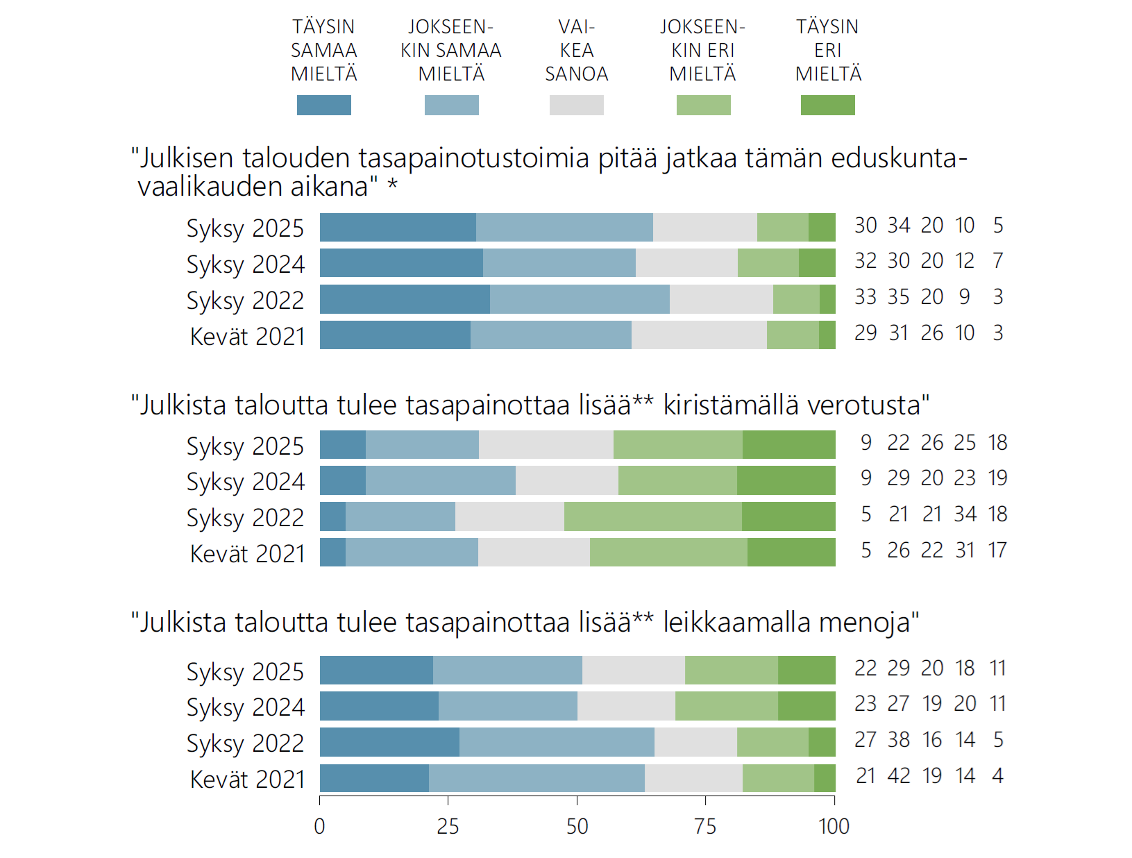 Puolet suomalaisista (51 %) on sitä mieltä, että julkista taloutta tulee tasapainottaa lisää leikkaamalla menoja, ja 29 prosenttia torjuu lisäleikkaukset. Veronkiristyksiä tasapainottamisen keinona kannattaa 31 prosenttia, ja 43 prosenttia torjuu veronkiristykset. Veronkiristysten kannatus on laskenut vuodessa 7 prosenttiyksikköä.